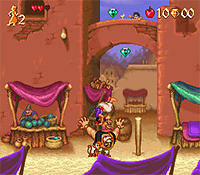 levels you will face a wide array of enemies, but you can dispatch the bad guys by throwing apples at them or using your sword. After you complete a level, you are treated to a bonus game. Only you can stop Jafar and try to woo the princess in Aladdin.